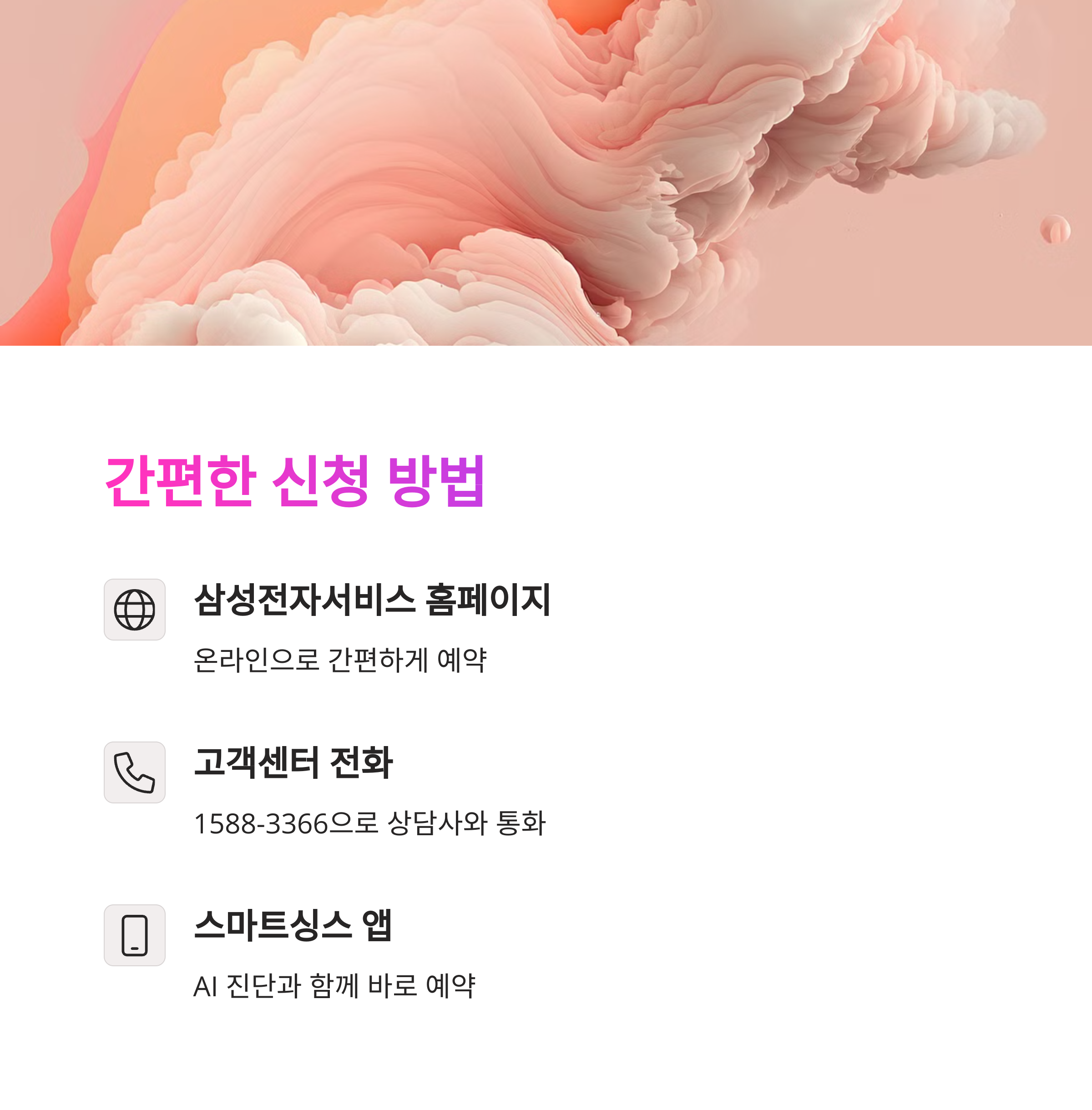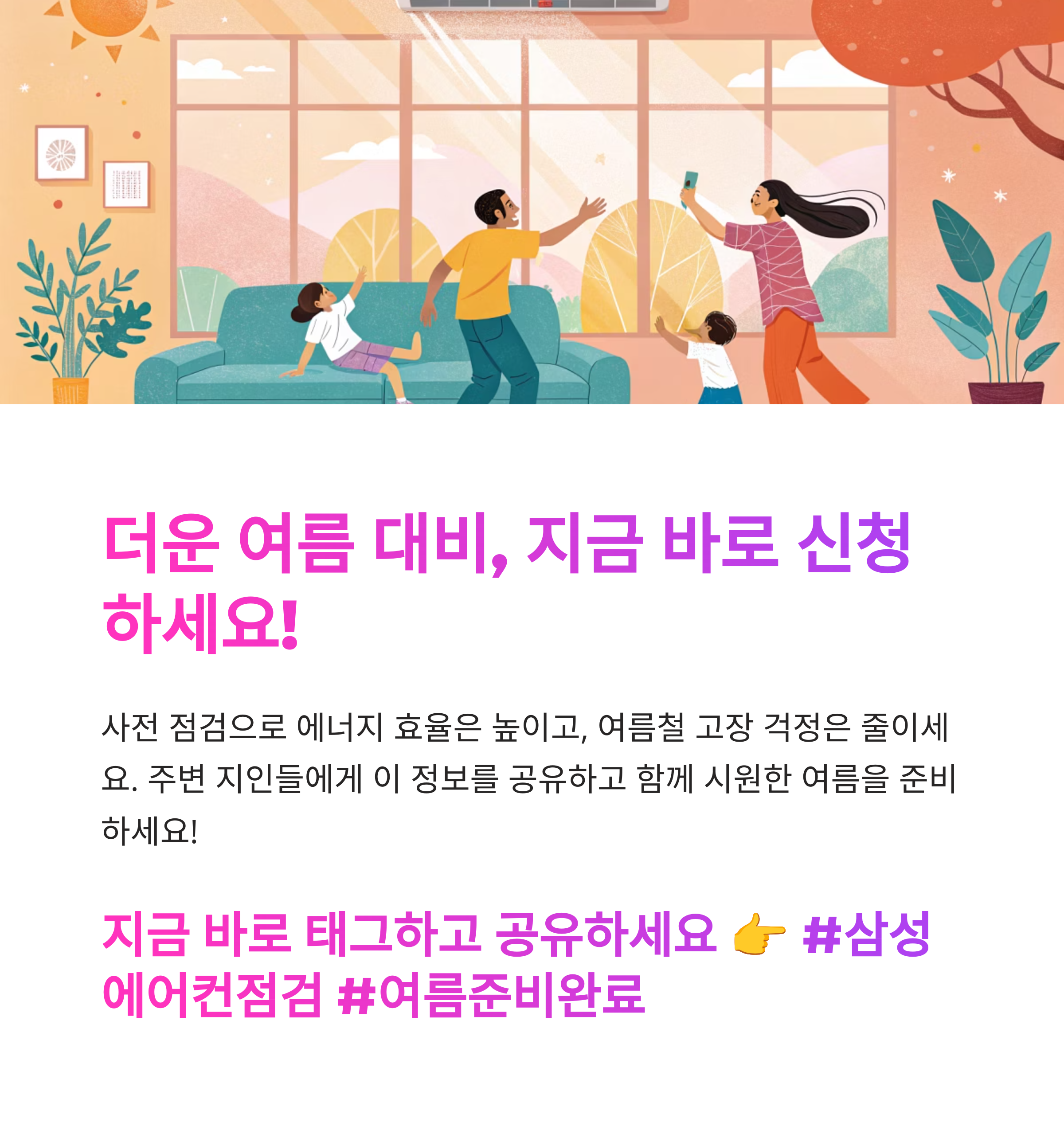 삼성전자 에어컨 무료 사전점검 서비스는 여름철을 대비해 미리 점검을 받을 수 있는 최고의 기회입니다. 자가 점검은 물론, AI 진단 기능까지 활용할 수 있으니 번거로움 없이 손쉽게 신청해보세요. 무더운 여름을 대비하는 가장 현명한 방법은 ‘지금’ 점검하는 것입니다. 아래 버튼을 눌러 바로 신청하세요!
