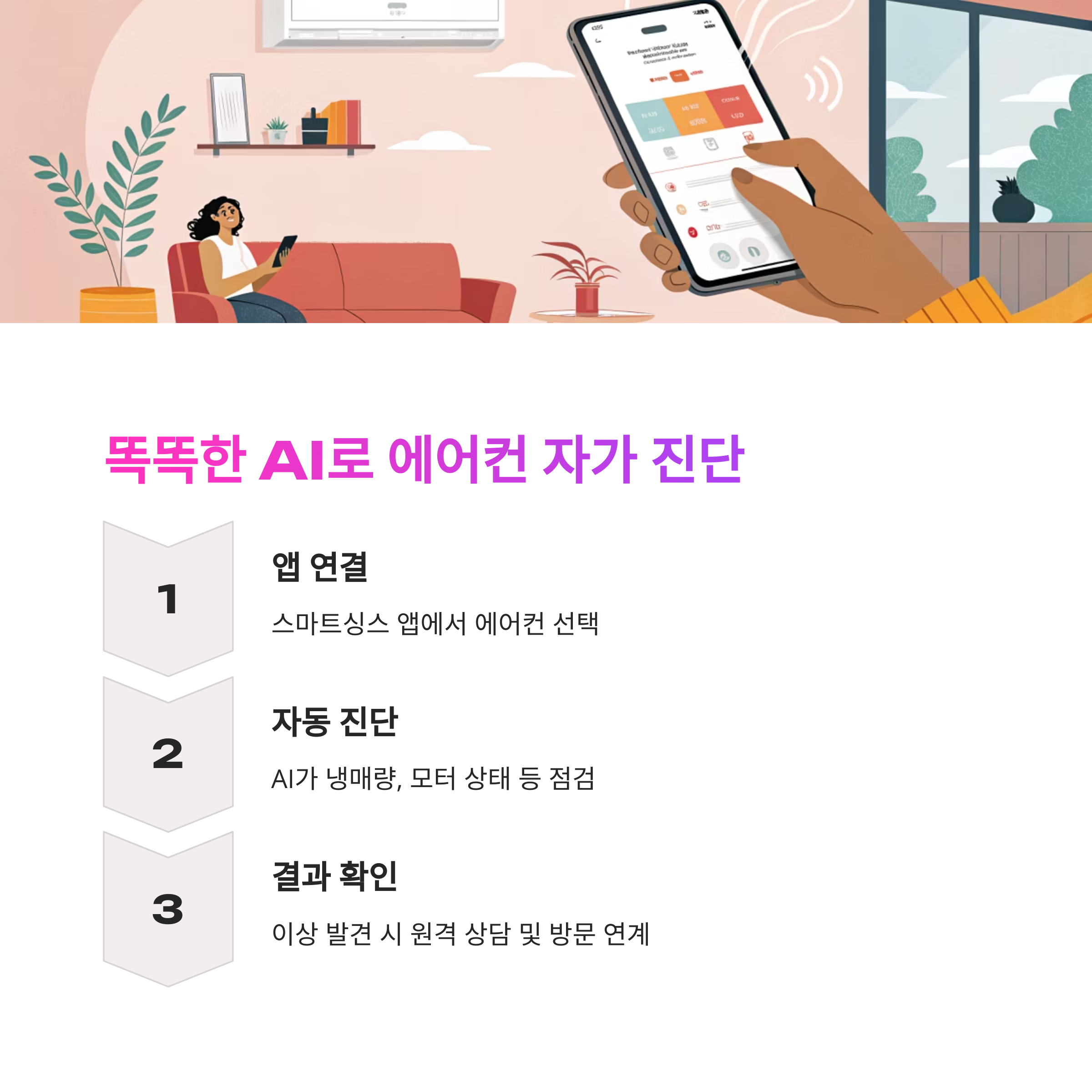 스마트싱스(SmartThings) 앱을 통해 에어컨을 등록하고 ‘AI 진단’ 기능을 실행하면 냉매량, 열교환기 온도, 팬 모터 상태 등을 자동으로 점검할 ❤️수 있습니다. 간단한 문제는 자가 해결이 가능하며, 이상이 발견되면 원격 상담 또는 방문 점검을 신청할 수 있습니다.