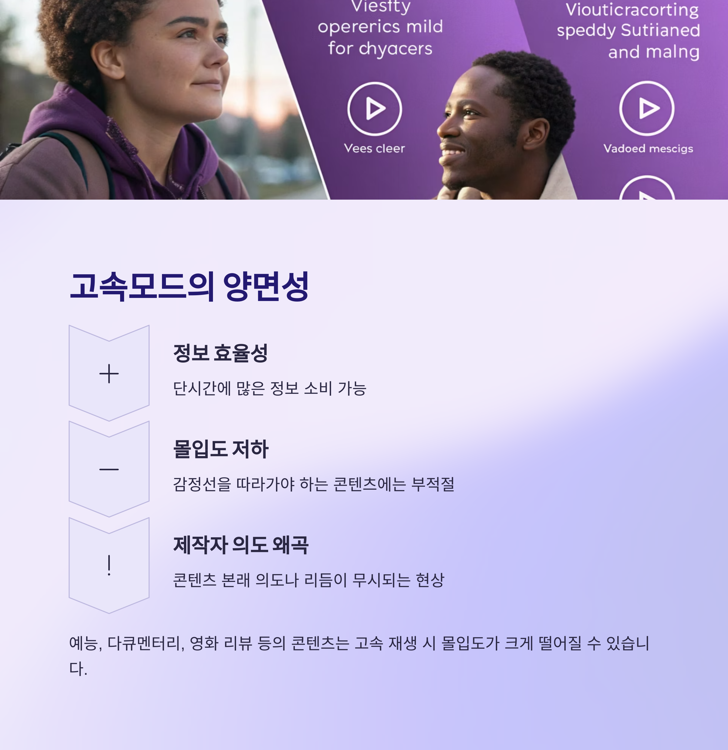 예능, 다큐멘터리, 영화 리뷰 등의 콘텐츠는 고속 재생 시 몰입도가 크게 떨어질 수 있습니다.