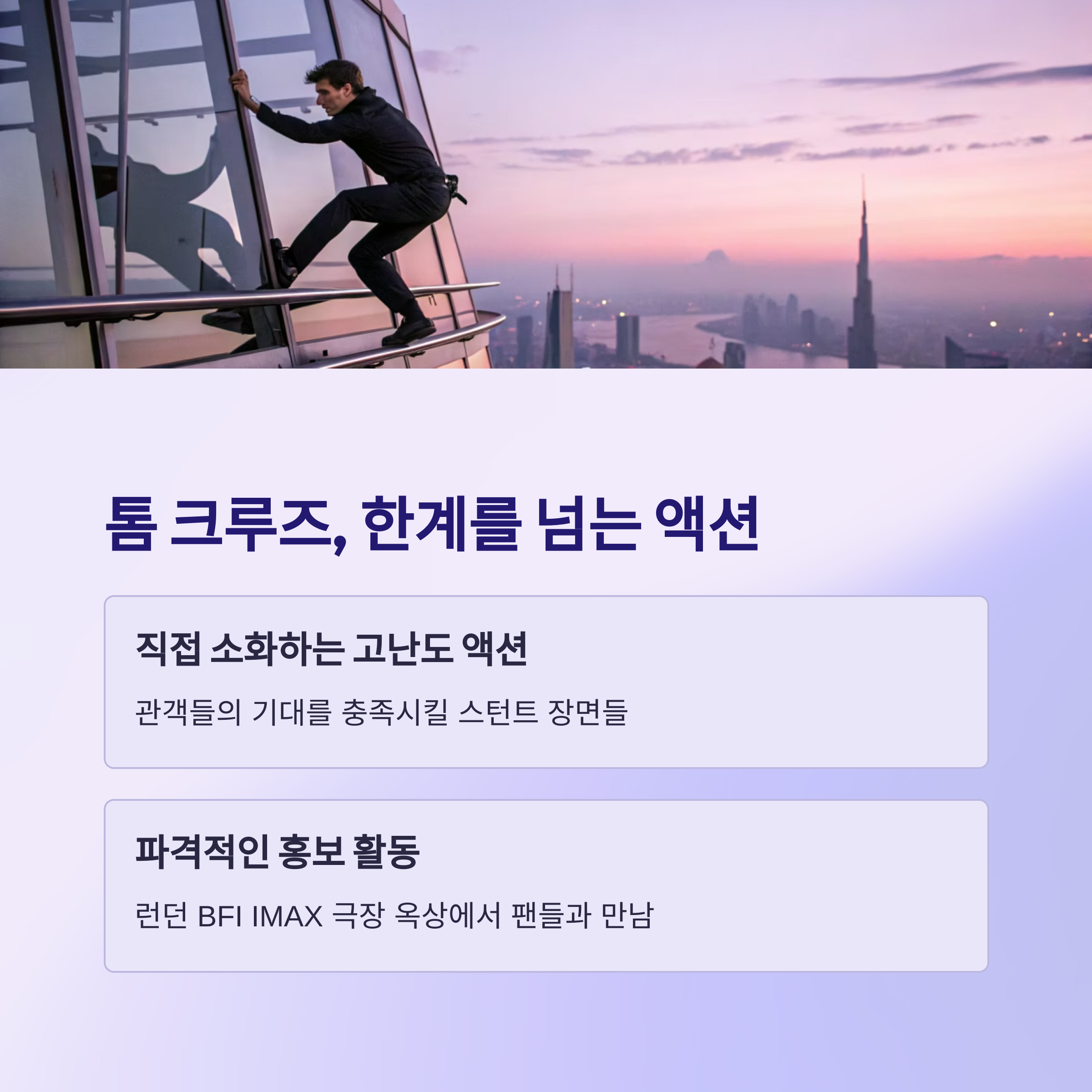 이번 작품에서도 톰 크루즈는 직접 고난도의 액션을 소화하며 관객들의 기대를 충족시킬 예정입니다. 특히, 런던의 BFI IMAX 극장 옥상에 올라 팬들과 인사를 나누는 등, 영화 홍보를 위한 파격적인 행보로 화제를 모으고 있습니다.