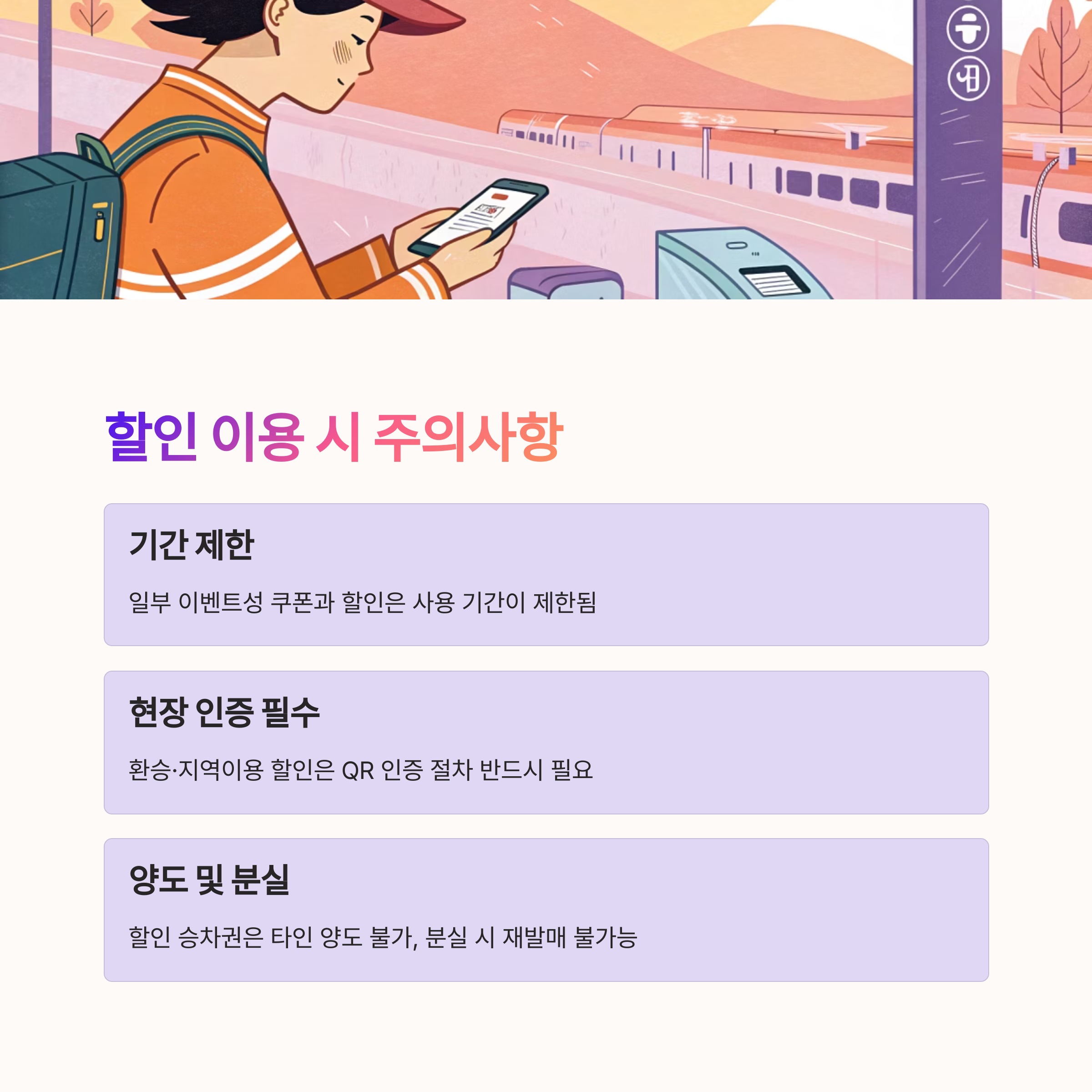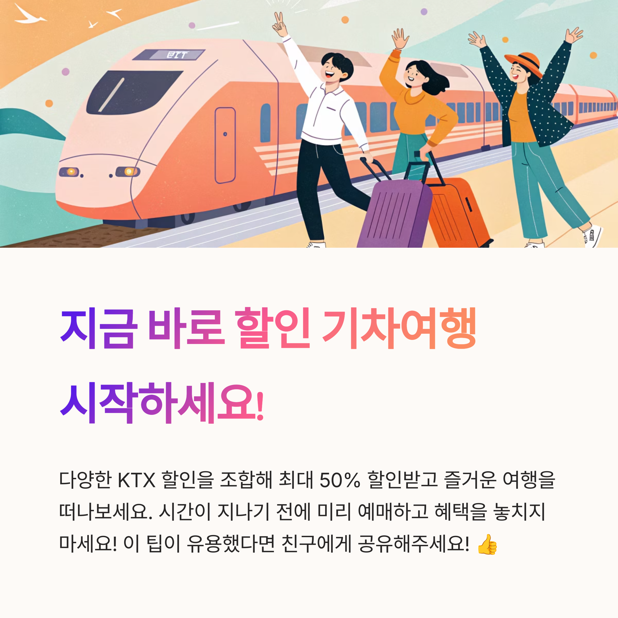 기차 여행을 더 저렴하게 떠나는 방법! 다양한 플랫폼을 활용하면 KTX를 최대 50%까지 할인받을 수 있다는 사실, 알고 계셨나요? 이제 복잡한 조건 없이 손쉽게 할인받고 즐거운 여행을 떠나보세요! 🚄