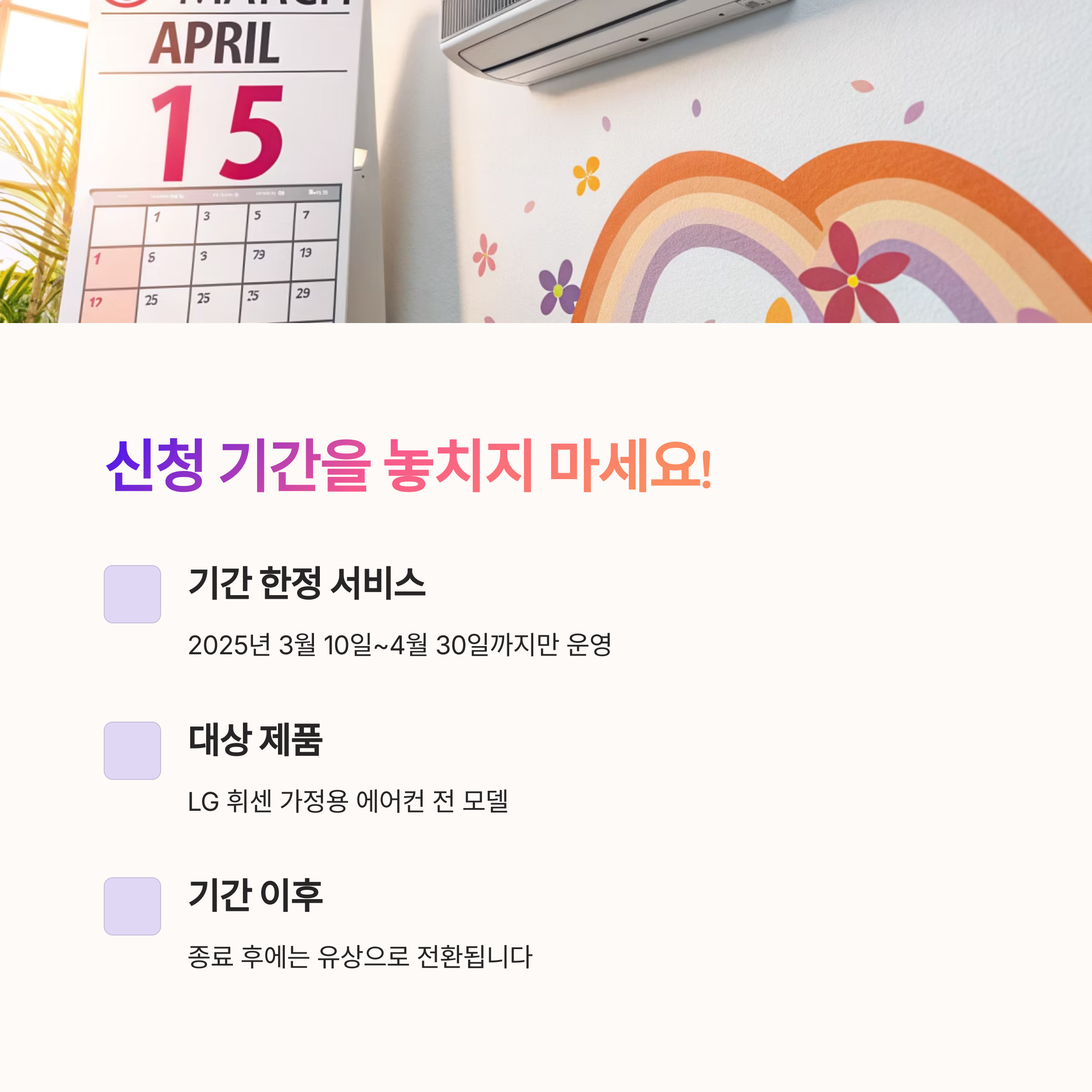 여름이 본격화되기 전, LG 에어컨 무상 사전점검 서비스를 꼭 이용해보세요!