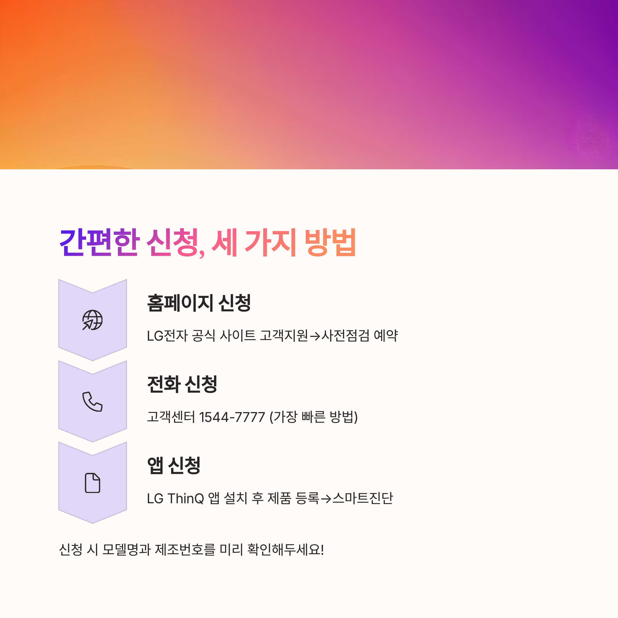 지금 바로 LG전자 홈페이지 또는 고객센터를 통해 신청하고, 불필요한 수리비와 스트레스를 미리 예방하세요!