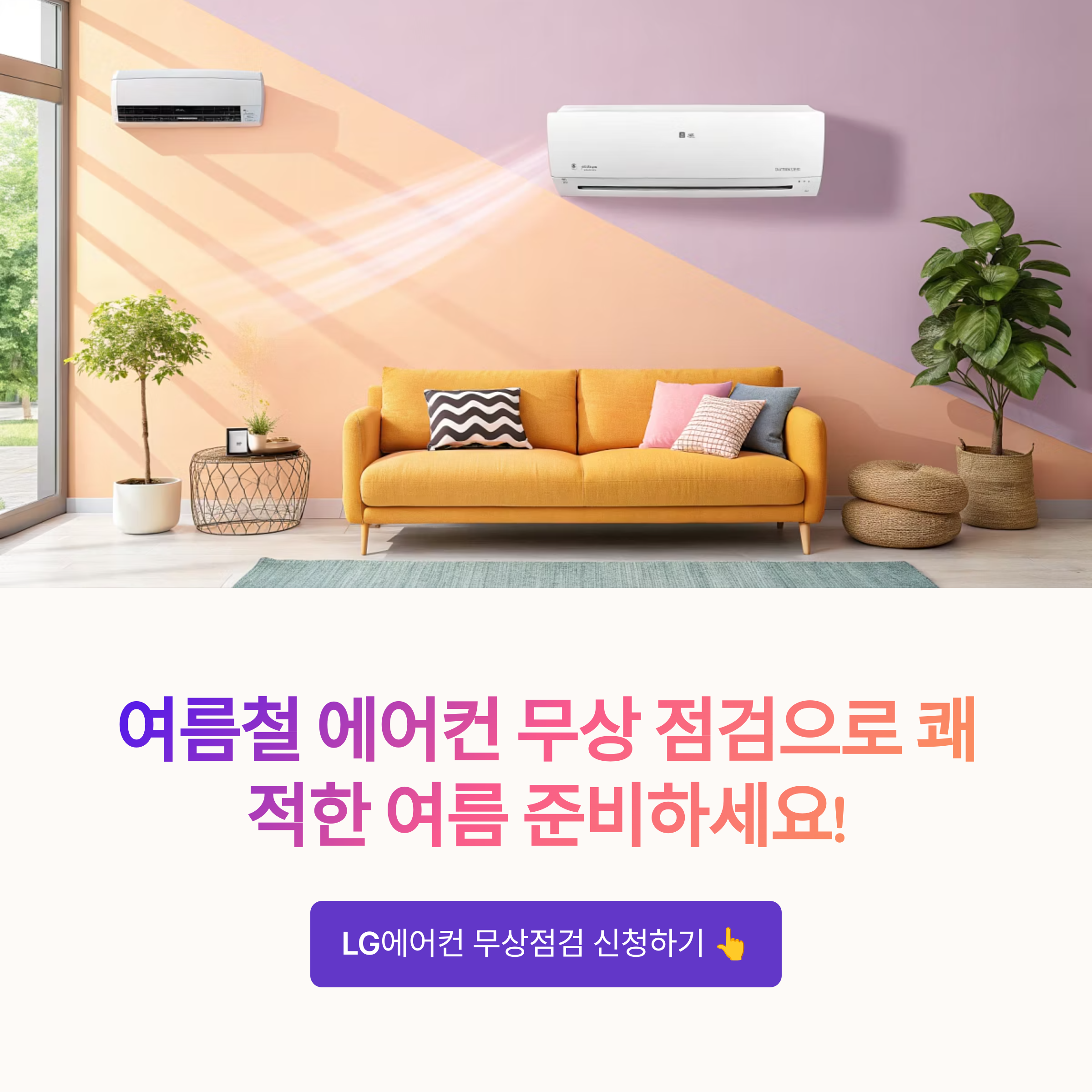 무더운 여름을 대비하는 가장 현명한 방법, 지금 바로 LG 에어컨 무상 사전점검을 신청하세요! 무료 점검 기회를 놓치면 본격적인 더위 속 고장으로 고생할 수 있습니다. 이번 기회를 통해 시원한 여름을 준비하는 비밀을 지금 공개합니다!
